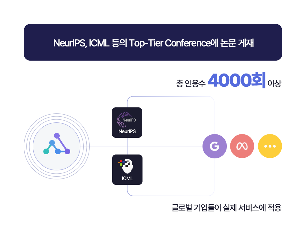 SconAI 기술은 NeurIPS, ICML 등 세계 최고 권위의 AI 학회에 다수 게재되었으며, 현재까지 4,000회 이상 인용되었습니다. Google, Meta를 포함한 글로벌 기업들도 이 기술을 실제 서비스에 적용하고 있습니다.